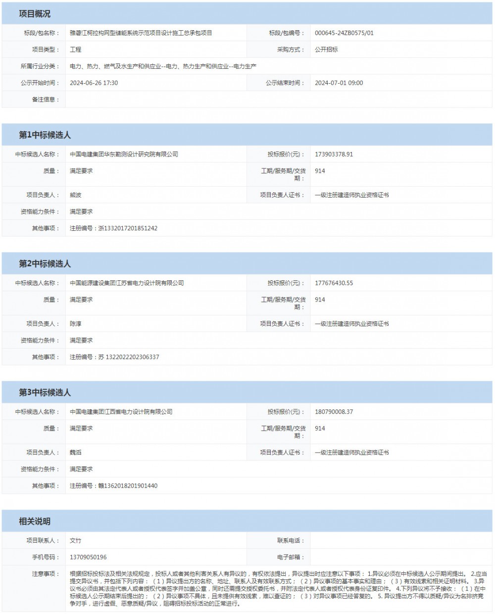 中标候选人第1名为中国电建集团华东勘测设计研究院有限公司,投标报价173903378.91元,折合单价1.641元/Wh;中标候选人第2名为中国能源建设集团江苏省电力设计院有限公司,投标报价177676430.55元,折合单价1.676元/Wh;中标候选人第3名为中国电建集团江西省电力设计院有限公司,投标报价180790008.37元,折合单价1.706元/Wh。