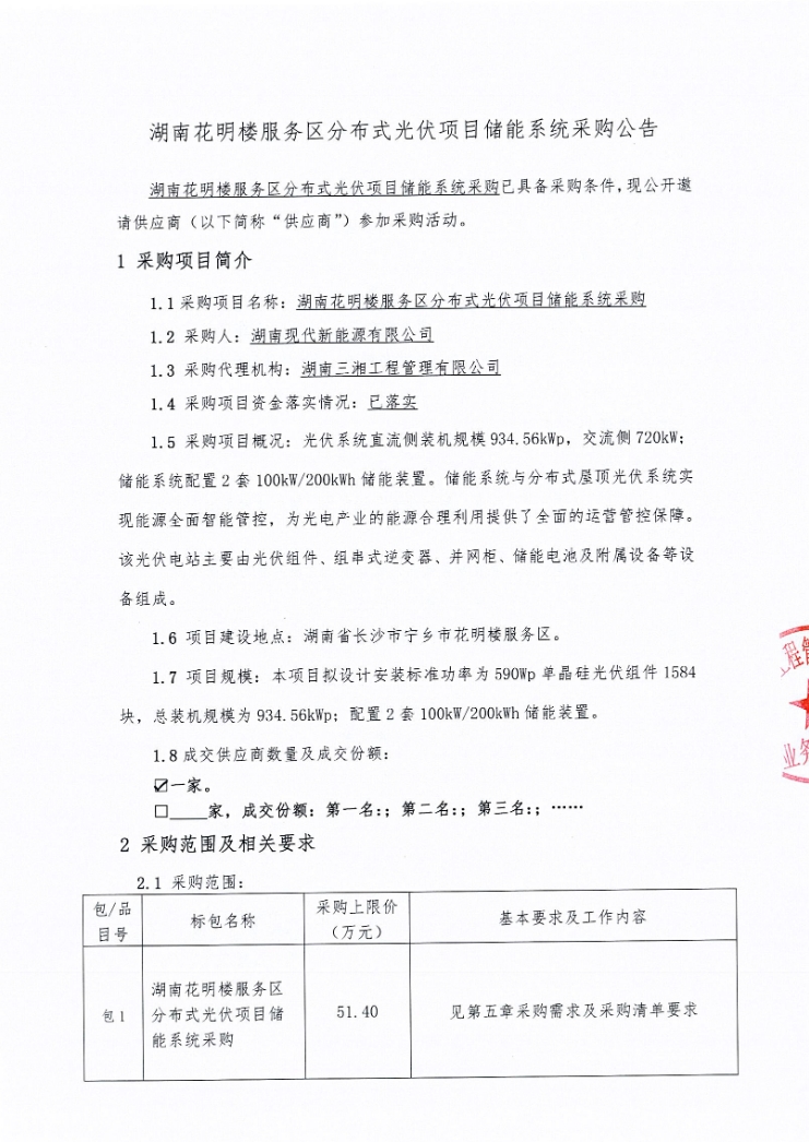 据电力家了解到,6月28日,湖南花明楼服务区分布式光伏项目储能系统采购公告发布。