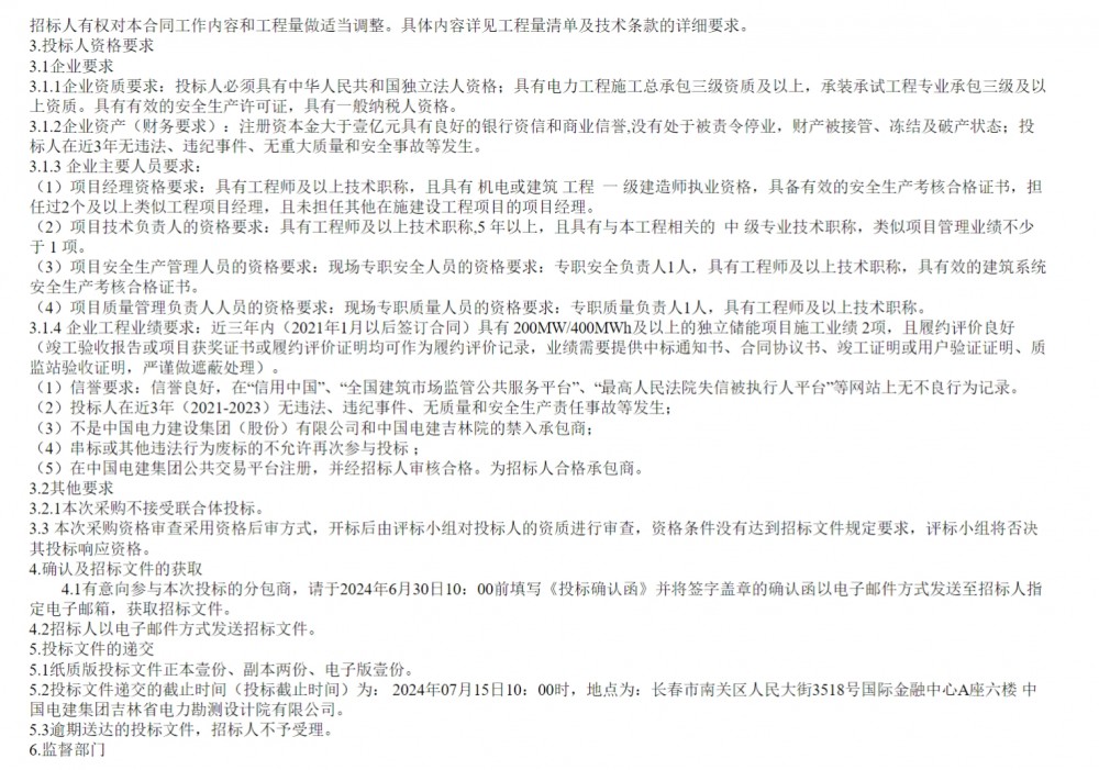 投标人要求近三年内(2021年1月以后签订合同)具有 200MW/400MWh及以上的独立储能项目施工业绩2项。