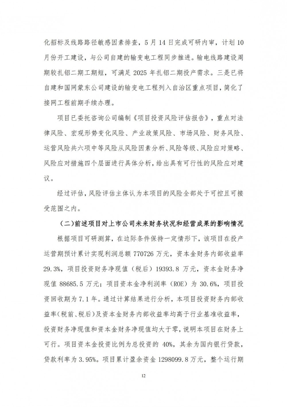 公告显示,电投能源拟投资31.01亿元建设通辽市扎哈淖尔35万吨绿电铝项目(扎铝二期)。该项目厂址位于内蒙古自治区通辽市扎鲁特旗扎哈淖尔产业园区内,紧邻霍林郭勒市。规划建设35万吨电解铝,配套建设65万千瓦风电项目、10万千瓦2小时电化学储能项目和38公里220千伏输变电工程,按照源网荷储一体化模式推进实施。该项目已纳入国家和地方发展规划。