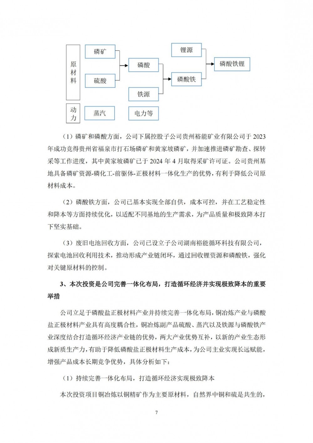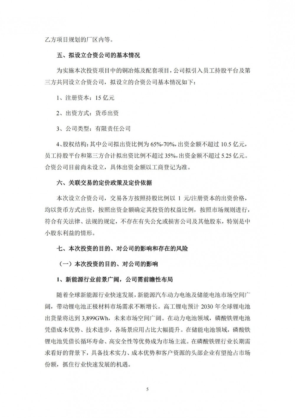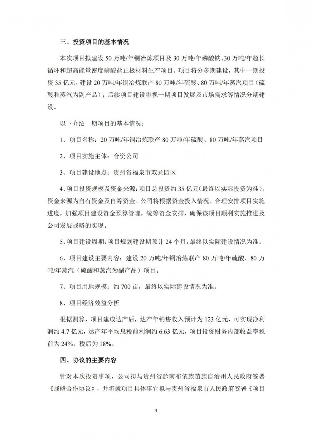 针对本次投资事项,公司拟与贵州省黔南布依族苗族自治州人民政府签署《战略合作协议》,并就项目具体事宜拟与贵州省福泉市人民政府签署《项目投资合同》。项目将分多期建设,其中一期投资35亿元,建设20万吨/年铜冶炼联产80万吨/年硫酸、80万吨/年蒸汽项目(硫酸和蒸汽为副产品)。
