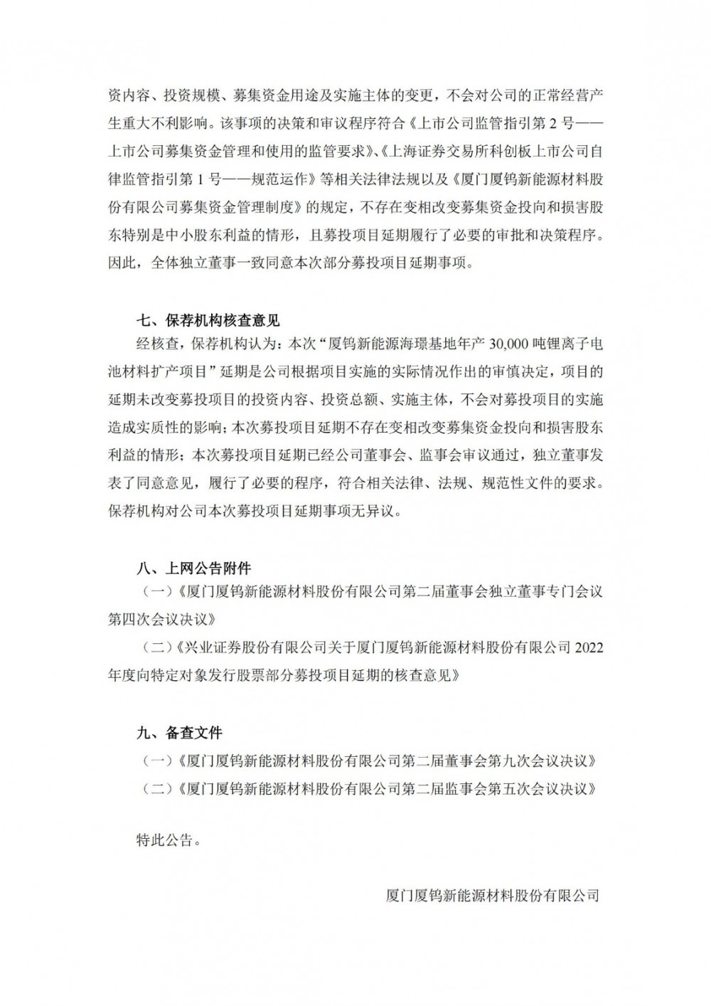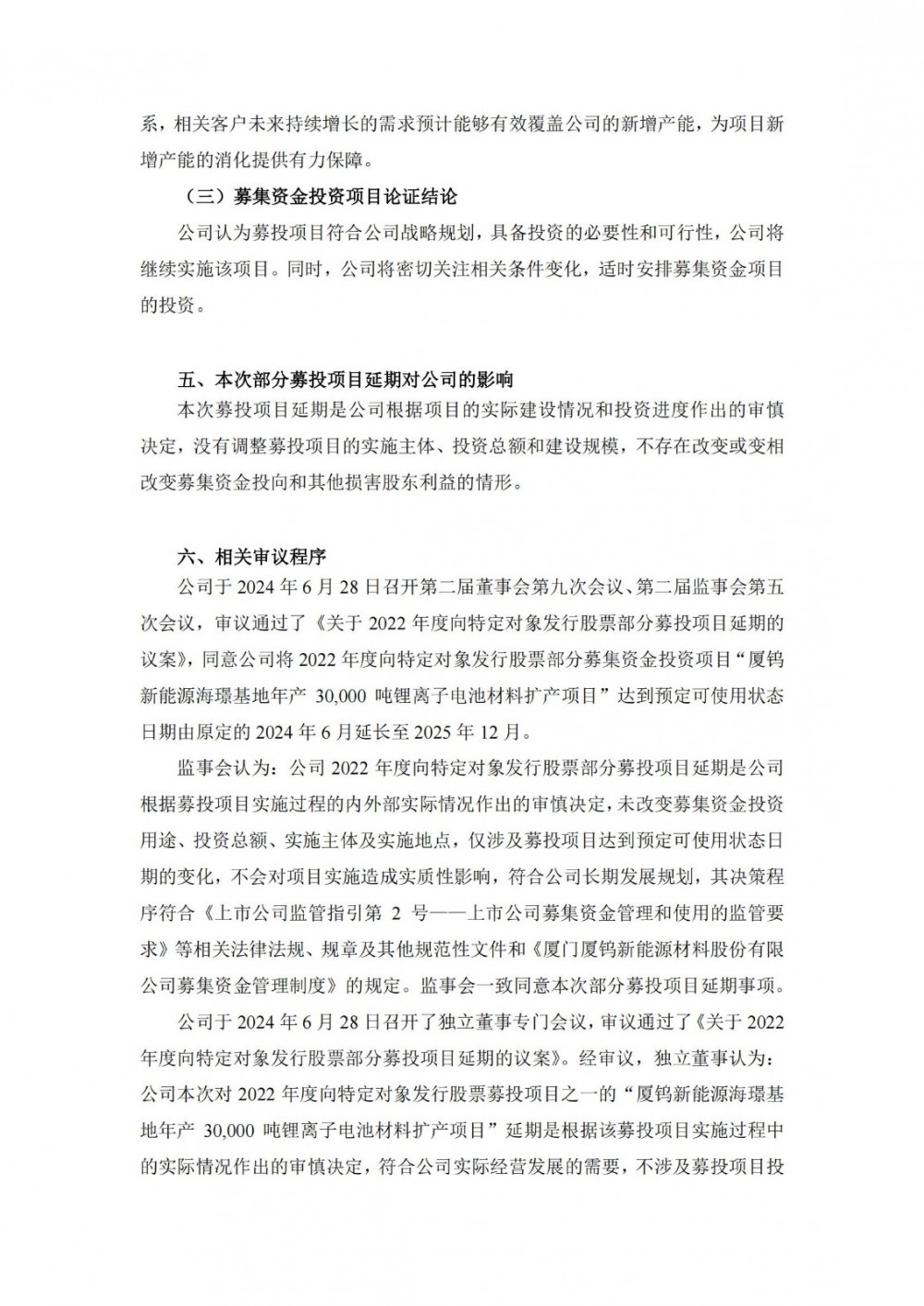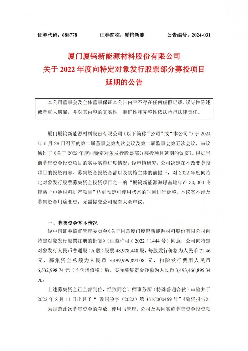 据电力家了解到,6月28日,厦钨新能发布公告称,公司决定在不改变募投项目的投资内容、募集资金投资金额以及实施主体的前提下,对2022年度向特定对象发行股票募集资金投资项目之一的“厦钨新能源海璟基地年产30,000吨锂离子电池材料扩产项目”达到预定可使用状态的时间进行调整。项目可使用状态日期由2024年6月变更为2025年12月。