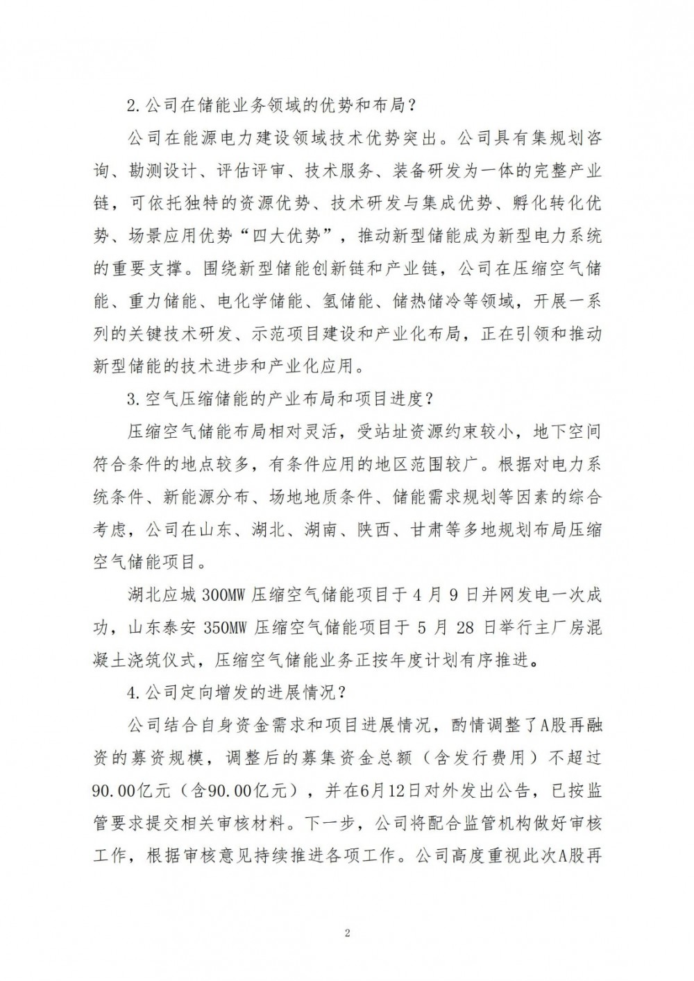 中国能建承建的湖北应城300MW压缩空气储能项目于4月9日并网发电一次成功,山东泰安350MW压缩空气储能项目于5月28日举行主厂房混凝土浇筑仪式,压缩空气储能业务正按年度计划有序推进。