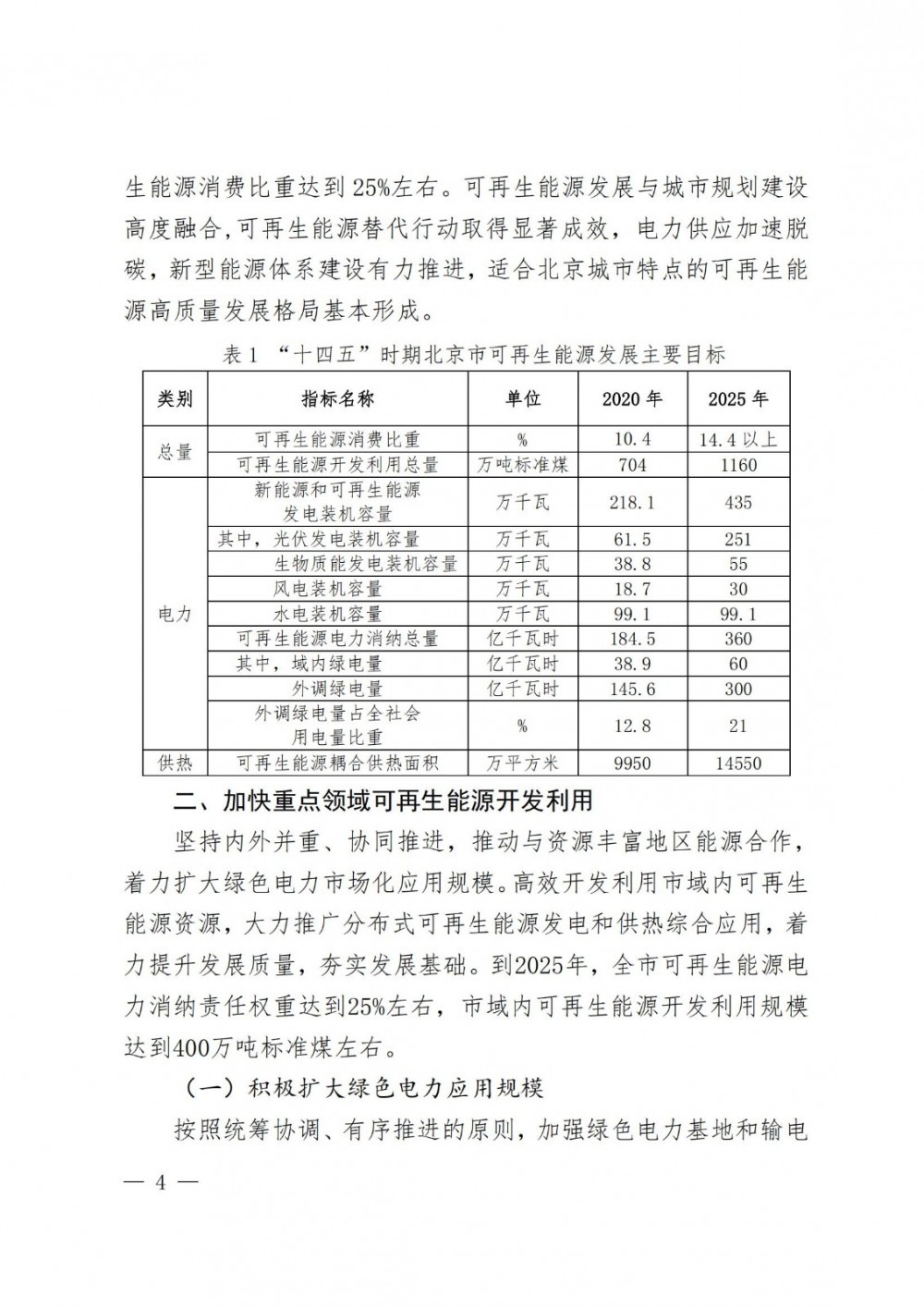 据电力家了解到,近日,北京市碳达峰碳中和工作领导小组办公室发布关于印发北京市可再生能源替代行动方案(2023—2025年)的通知。