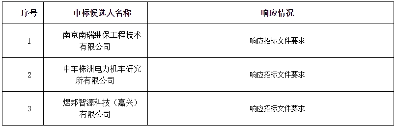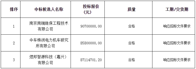 第一中标候选人为南京南瑞继保工程技术有限公司,投标报价90700000元;第二中标候选人为中车株洲电力机车研究所有限公司,投标报价85800000元;第三中标候选人为煜邦智源科技(嘉兴)有限公司,投标报价87114701.2元。