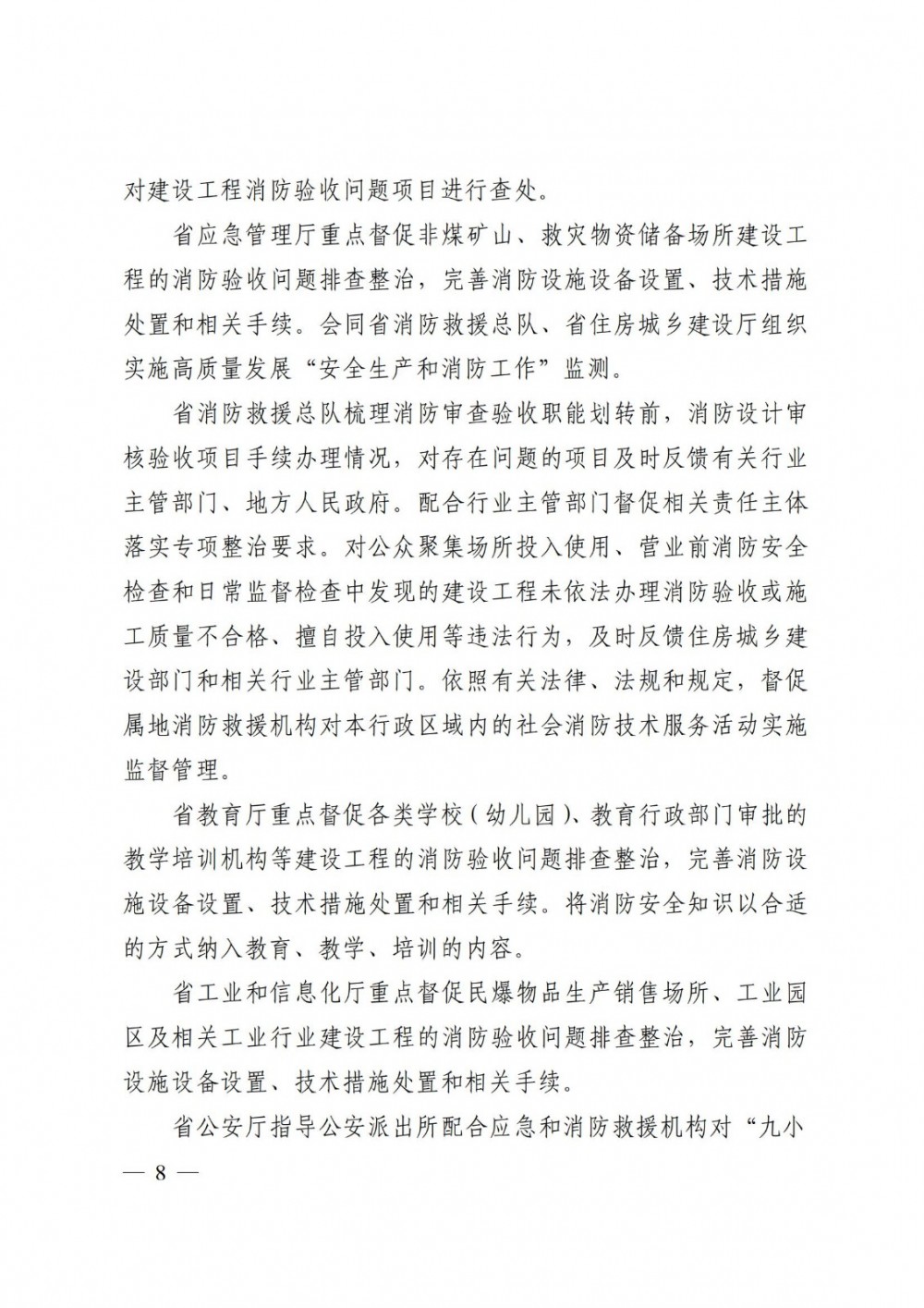 省电网公司负责本企业职责范围内建设工程的消防验收问题 排查整治,完善消防设施设备设置、技术措施处置和相关手续。 依法依规加强输配电设施和线路安全检查,配合省主管部门、单 位做好安全用电知识宣传提醒和指导。