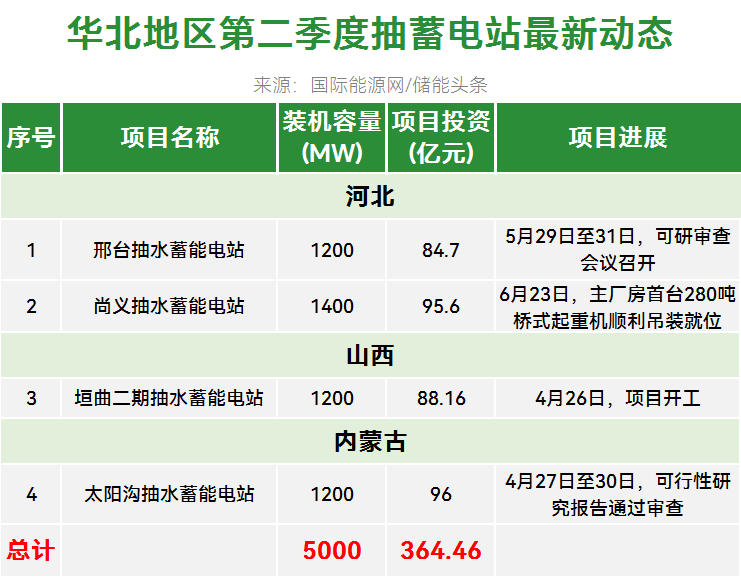 华北地区有4个抽水蓄能电站更新了动态,装机总规模为5GW,项目总投资364.46亿元。