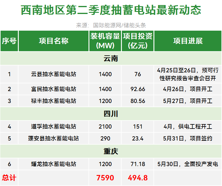 西南地区有6个抽水蓄能电站更新了动态,装机总规模为7.59GW,项目总投资494.8亿元。