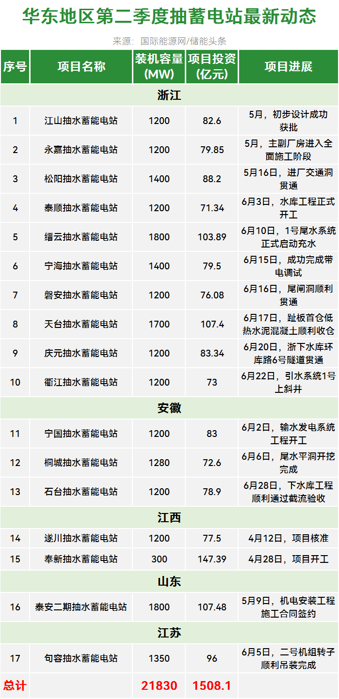 华东地区有17个抽水蓄能电站更新了动态,装机总规模为21.83GW,项目总投资1508.07亿元。