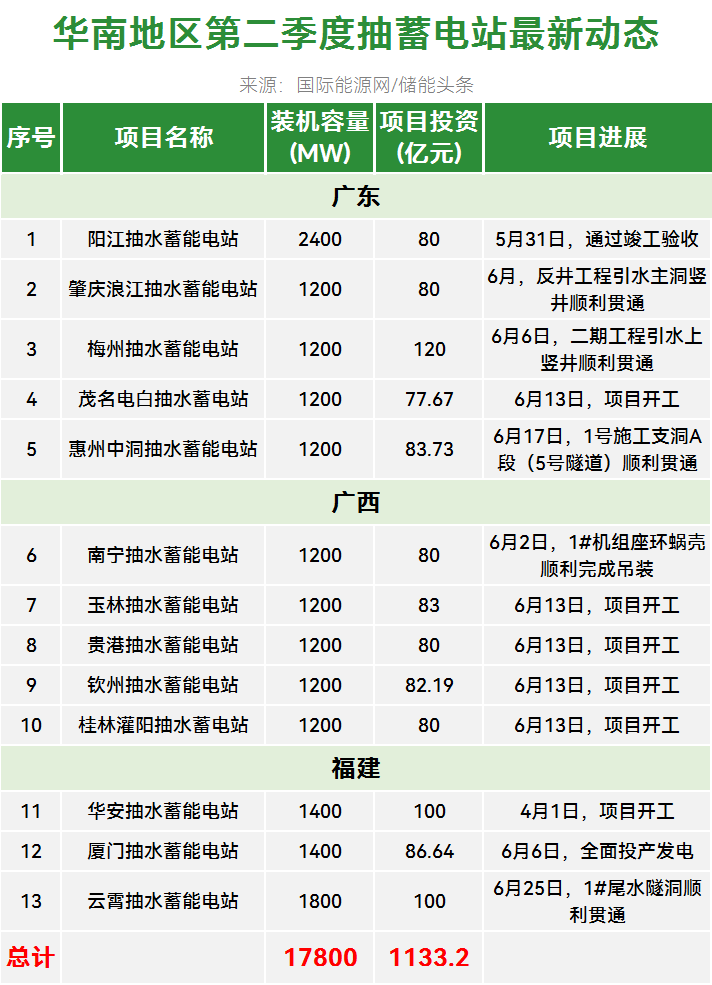 华南地区有13个抽水蓄能电站更新了动态,装机总规模为17.8GW,项目总投资1133.23亿元。