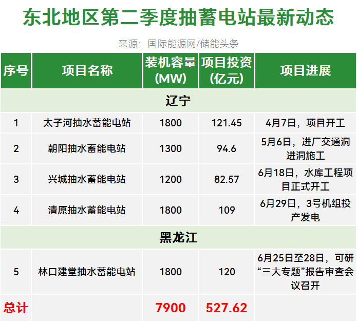 东北地区有5个抽水蓄能电站更新了动态,装机总规模为7.9GW,项目总投资527.62亿元。