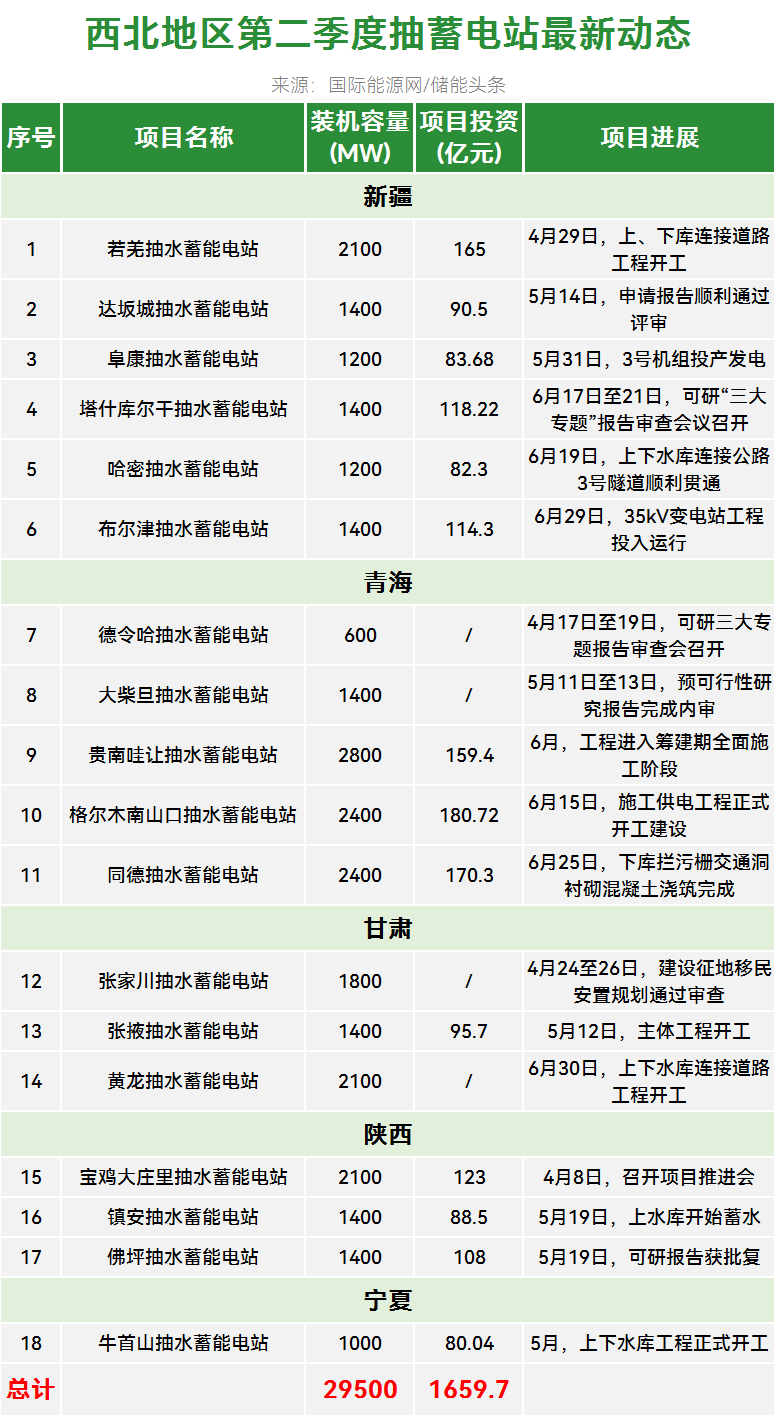 西北地区有18个抽水蓄能电站更新了动态,装机总规模为29.5GW,项目总投资1659.66亿元。