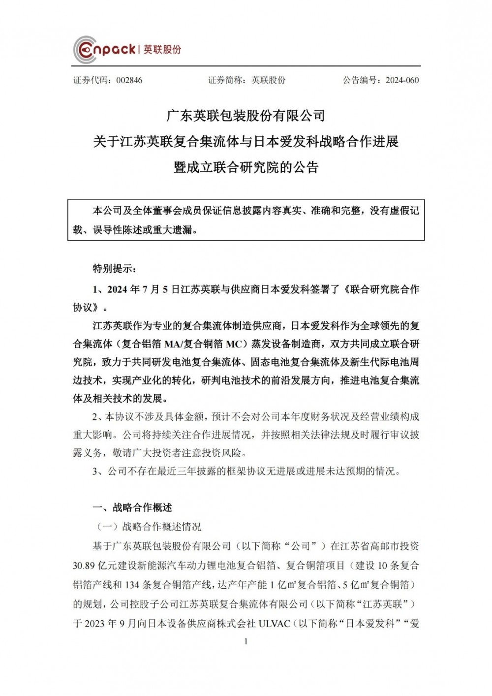 据电力家了解到,7月5日,英联股份发布公告称,公司与供应商日本爱发科签署了《联合研究院合作议》。双方共同成立联合研究院,致力于共同研发电池复合集流体、固态电池复合集流体及新生代际电池周边技术,实现产业化的转化,研判电池技术的前沿发展方向,推进电池复合集流体及相关技术的发展。