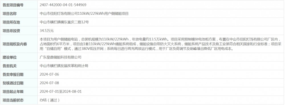 据电力家了解到,近日,中山市佳阳灯饰有限公司110kW/229kWh用户侧储能项目获得备案。项目位于中山市横栏镇横东富庆二路12号,总投资34.5万元。