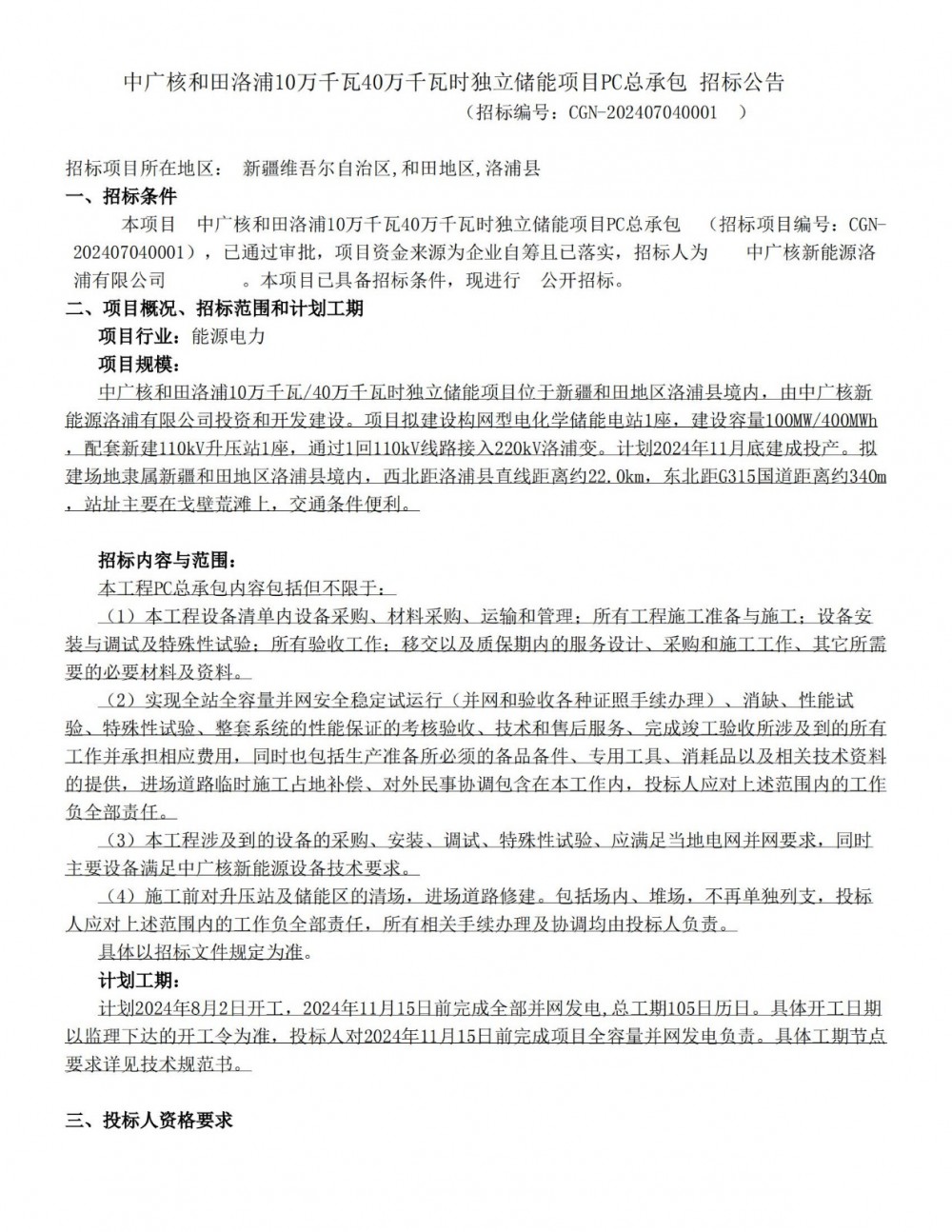 据电力家了解到,7月5日,中广核和田洛浦10万千瓦40万千瓦时独立储能项目PC总承包招标公告发布。
