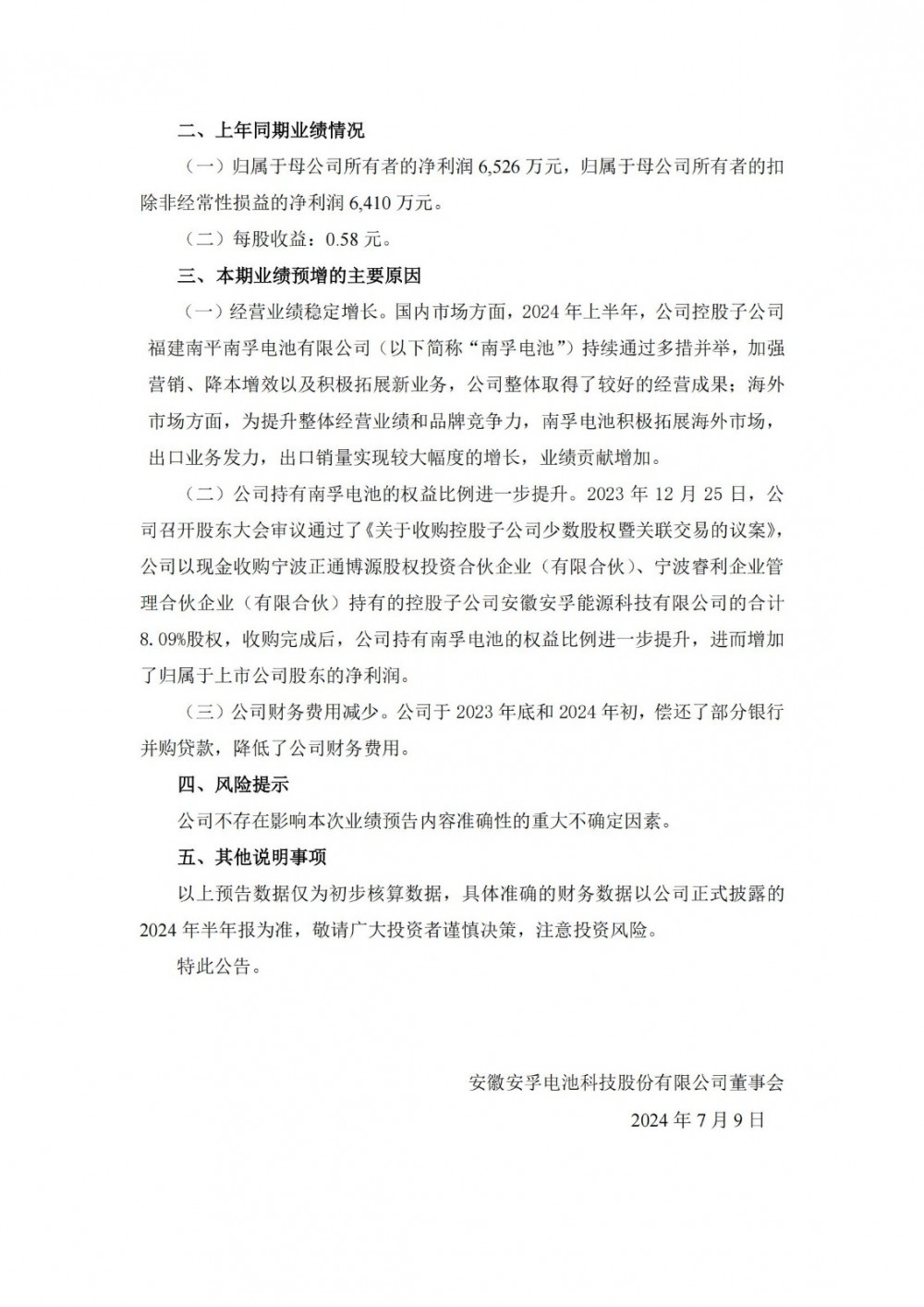 (一)经营业绩稳定增长。国内市场方面,2024年上半年,公司控股子公司福建南平南孚电池有限公司(以下简称“南孚电池”)持续通过多措并举,加强营销、降本增效以及积极拓展新业务,公司整体取得了较好的经营成果;海外市场方面,为提升整体经营业绩和品牌竞争力,南孚电池积极拓展海外市场,出口业务发力,出口销量实现较大幅度的增长,业绩贡献增加。