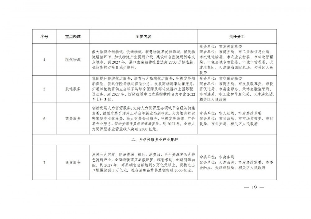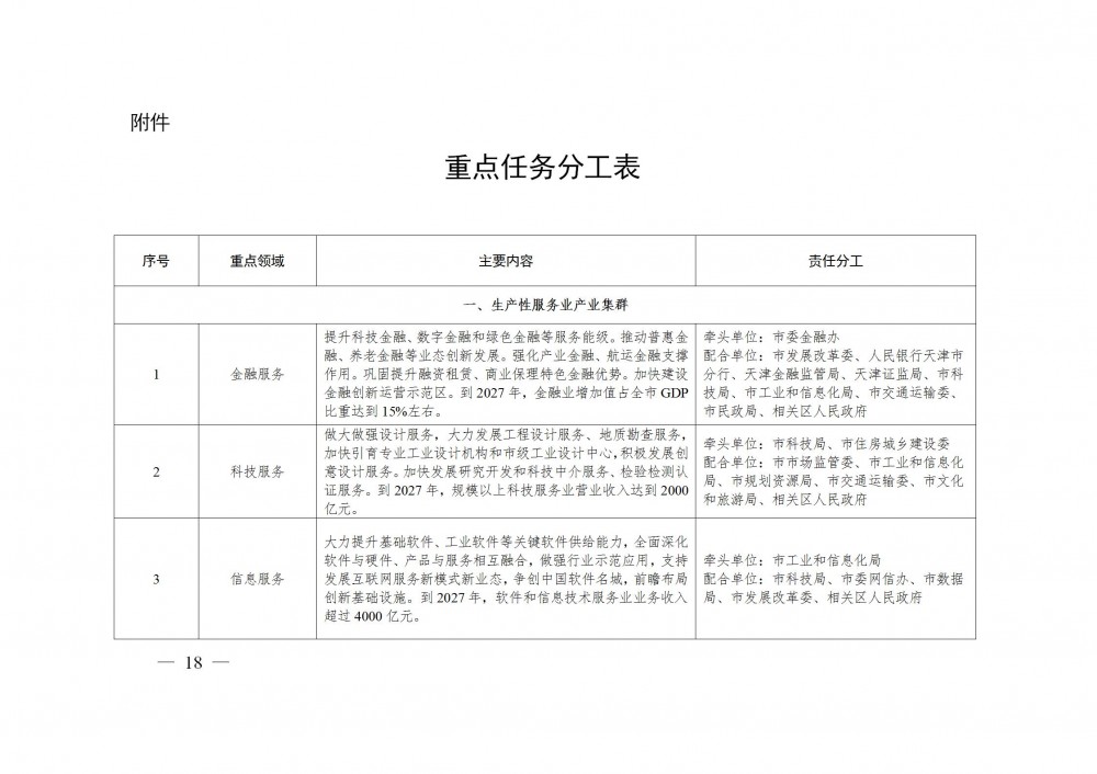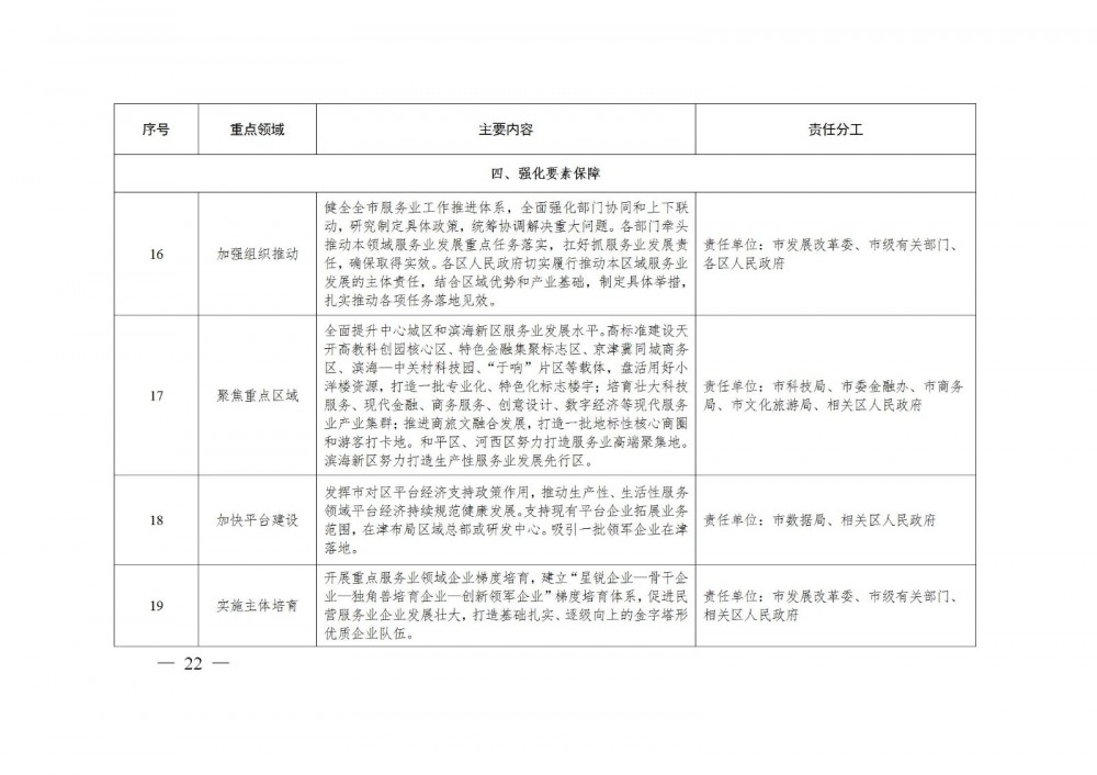 (十七)聚焦重点区域。全面提升中心城区和滨海新区服务业发展水平。高标准建设天开高教科创园核心区、特色金融集聚标志区、京津冀同城商务区、滨海—中关村科技园、“于响”片区等载体,盘活用好小洋楼资源,打造一批专业化、特色化标志楼宇;培育壮大科技服务、现代金融、商务服务、创意设计、数字经济等现代服务业产业集群;推进商旅文融合发展,丰富消费业态,打造一批地标性核心商圈和游客打卡地。和平区、河西区引聚各类优质资源,努力打造服务业高端聚集地。滨海新区强化服务先进制造业能力,努力打造生产性服务业发展先行区。