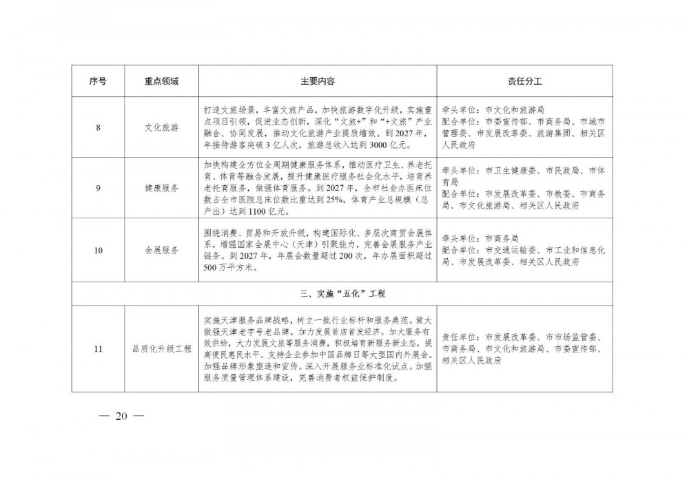 (八)文化旅游。深度发掘津派历史文化资源,以文化人、以文惠民、以文润城、以文兴业,加强历史文化遗产、红色文化资源保护和活化利用,健全现代文化产业体系、市场体系和公共文化服务体系,实施重点项目引领,促进业态创新,打造具有鲜明特色和深刻内涵的文化品牌,深化“文旅+”和“+文旅”产业融合、协同发展,推动文化旅游产业提质增效,到2027年,年接待游客突破3亿人次,旅游总收入达到3000亿元。