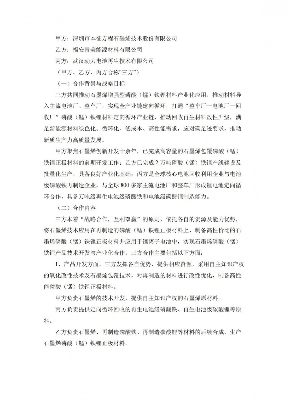 三方决定组合技术优势、产业优势与市场优势,从磷酸铁锂电池与废料的回收利用开始,联合开发石墨烯增强型磷酸(锰)铁锂材料产业化技术,以石墨烯技术提升循环再制造的磷酸(锰)铁锂材料的导电性和电化学性能,从而提高电池的能量密度和循环寿命,让循环再制造的磷酸(锰)铁锂材料高值化再利用,并快速推进市场化,化解未来庞大磷酸铁锂电池回收利用绿色化与经济化矛盾,打造世界核心石墨烯磷酸(锰)铁锂正极材料制造基地,推动全球新能源绿色可持续发展。