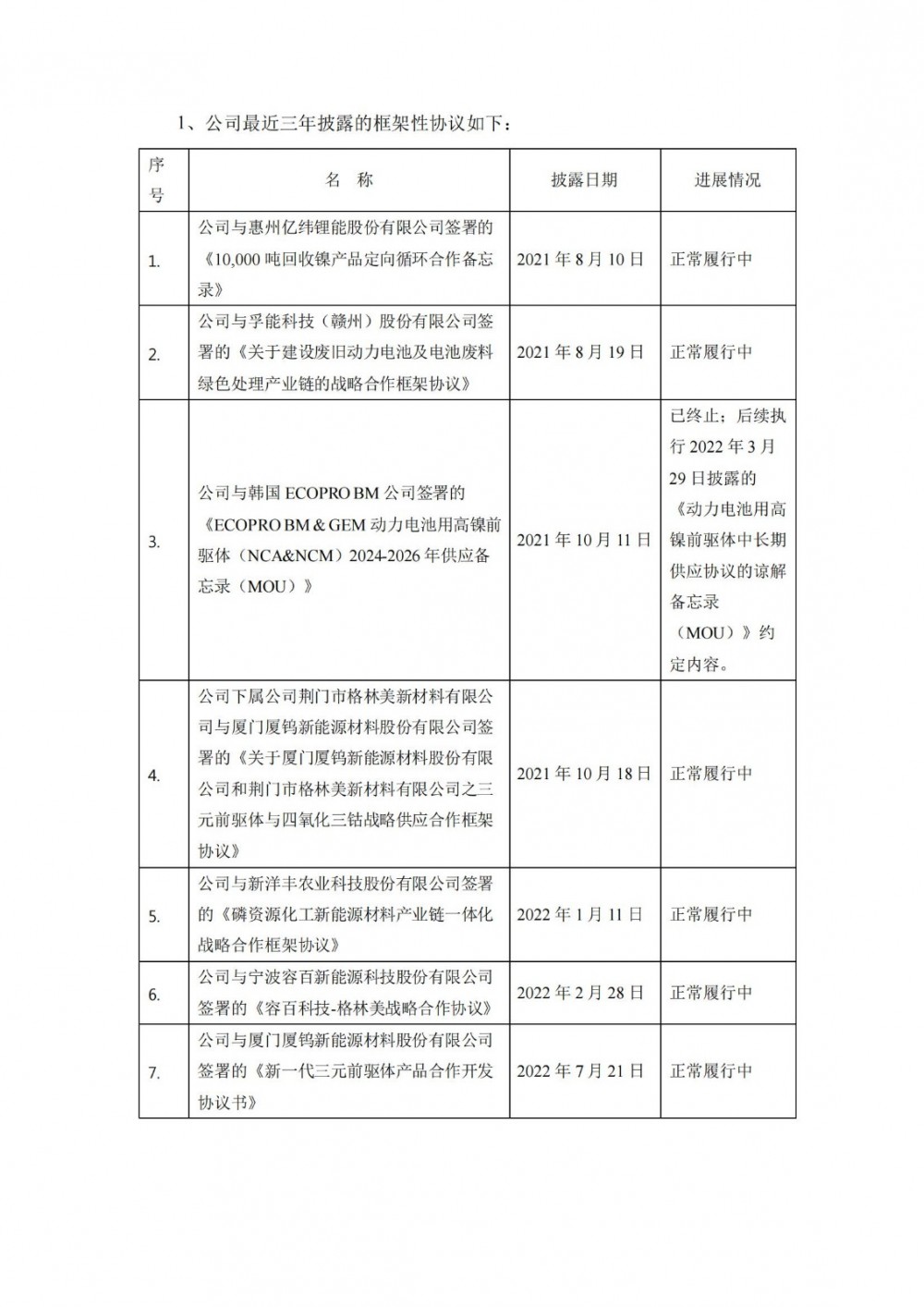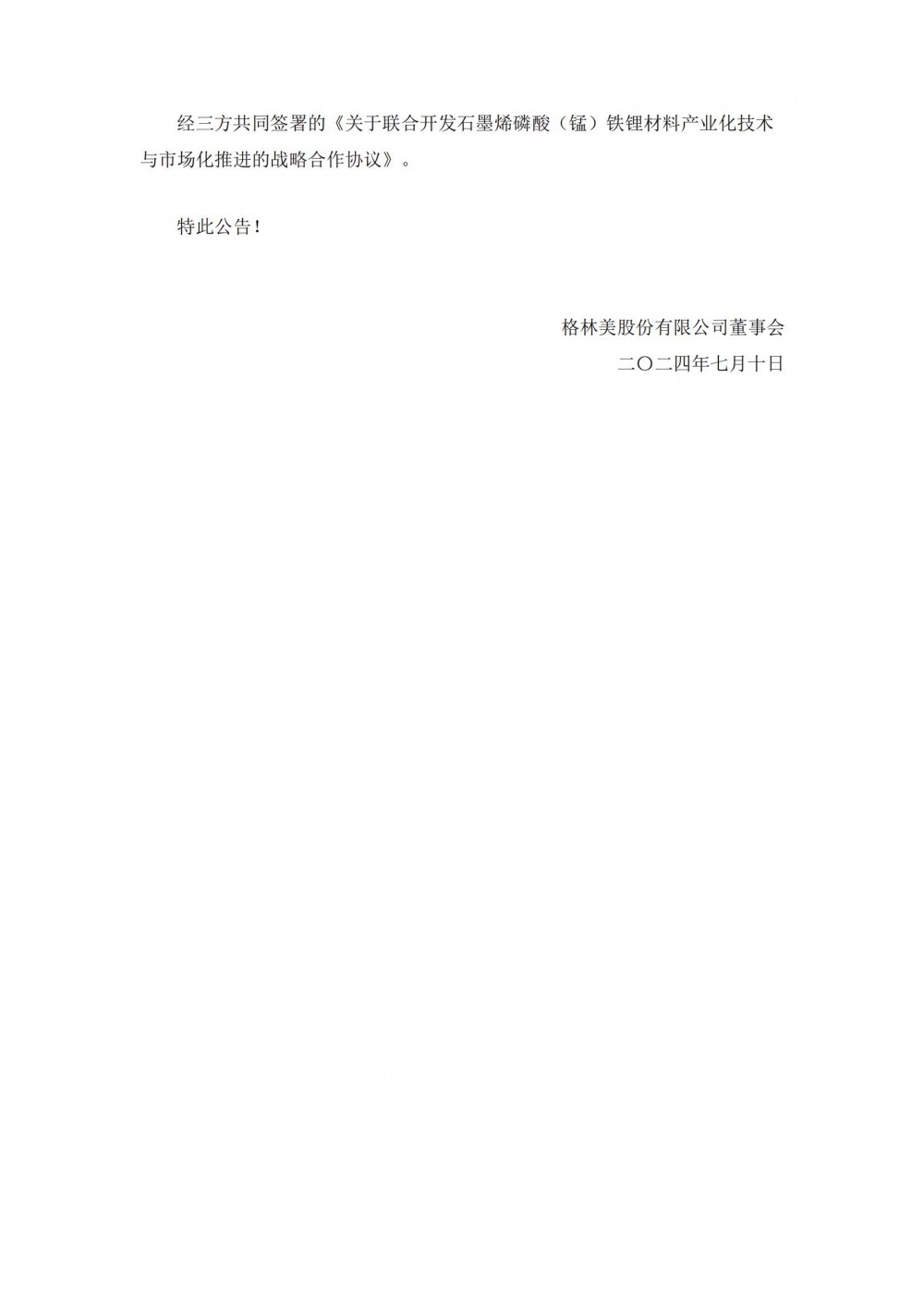 格林美表示,本次签署战略合作协议,联合开发石墨烯磷酸(锰)铁锂材料产业化技术与市场化推进,有利于组合技术优势、产业优势与市场优势,共同推动石墨烯增强型磷酸(锰)铁锂材料产业化应用,推动材料导入主流电池厂、整车厂,实现全产业链定向循环,打通“整车厂—电池厂—回收厂”磷酸(锰)铁锂材料定向循环产业链,推动回收再生材料改性升级,满足新能源材料绿色化、循环化、低成本、高性能需求,应对碳足迹要求,推动新质生产力高质量发展,符合公司长期战略发展和广大投资者的利益。
