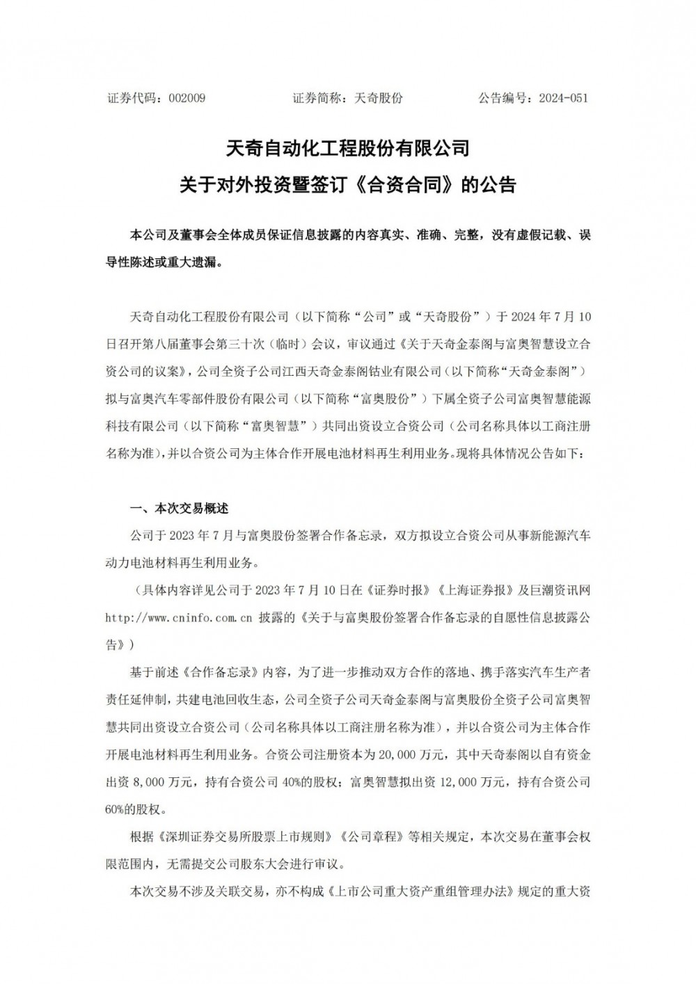 7月10日,天奇股份发布公告称,公司全资子公司江西天奇金泰阁钴业有限公司拟与富奥汽车零部件股份有限公司(以下简称“富奥股份”)下属全资子公司富奥智慧能源科技有限公司共同出资设立合资公司,并以合资公司为主体合作开展电池材料再生利用业务。