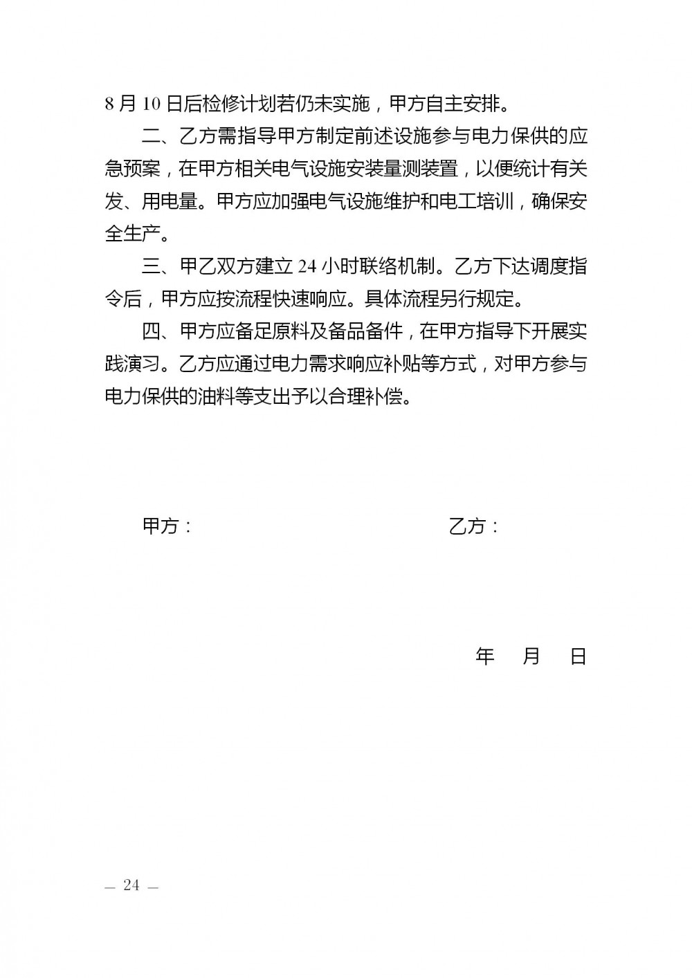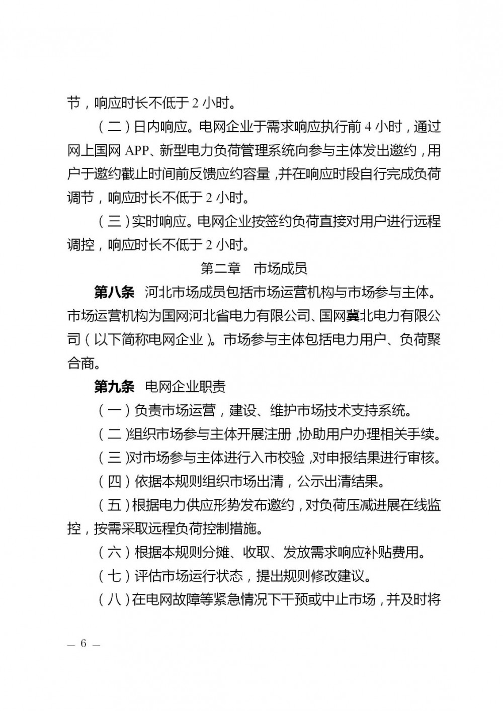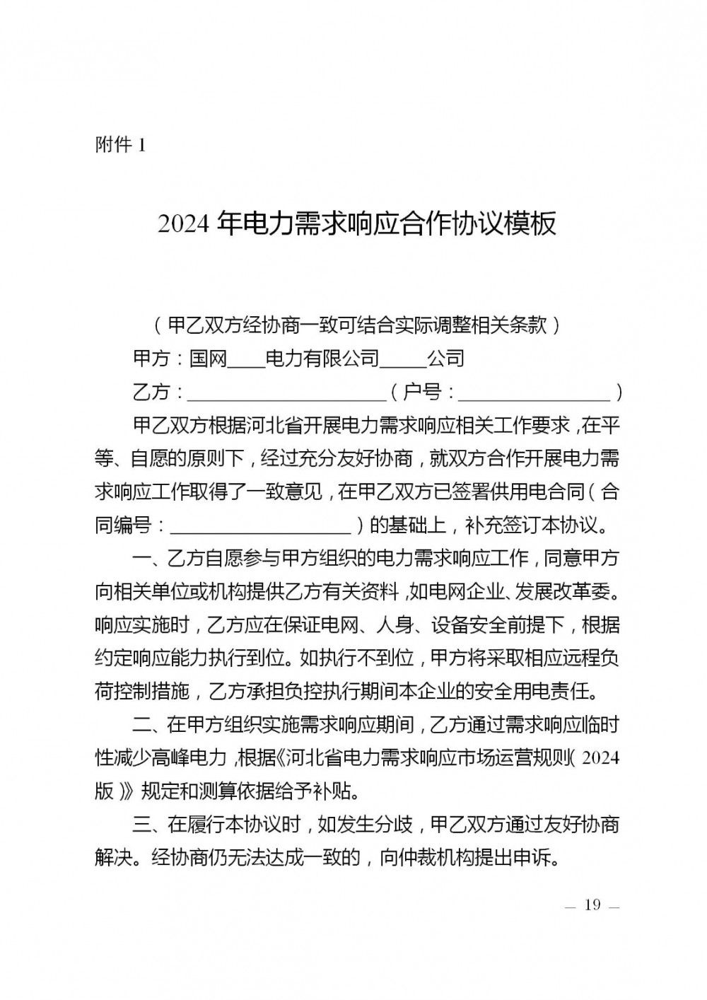 为保障能源电力安全,按照《电力需求侧管理办法(2023年版)》《电力负荷管理办法(2023年版)》等文件要求,我委组织国网河北省电力有限公司、国网冀北电力有限公司,结合我省实际,制定了《河北省电力需求响应市场运营规则(2024年版)》,现印发给你们,请认真贯彻执行。执行中如遇重大问题,请及时报告。