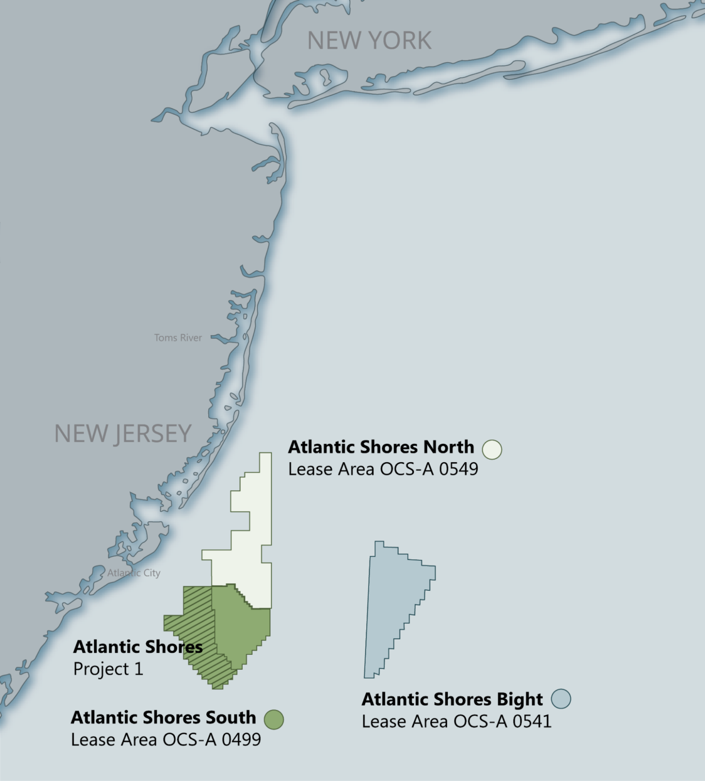 合资企业Atlantic Shores Offshore Wind拥有三个海上风电区域的租赁权,这些区域正在积极开发中。其中两个区域位于新泽西州海岸外约16至32公里处,位于大西洋城(Atlantic City )和巴尼加特灯塔(Barnegat Light)之间,另一个区域位于纽约湾。