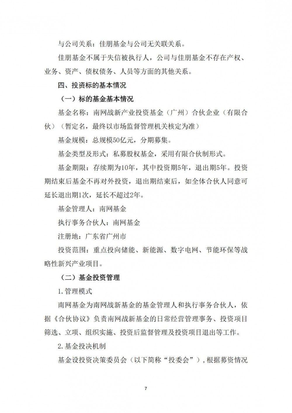 南网战新基金认缴出资总额不超过人民币50亿元,其中公司与南网基金以及南方电网公司部分全资、控股企业认缴出资30%,南方电网公司系统外有关企业认缴出资70%。