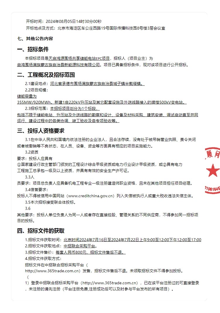 7月15日,天启鸿源围场共享储能电站EPC招标公告发布,储能规模355MW/920MWh。