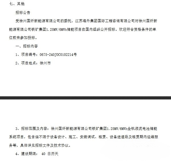 徐州国纤新能源有限公司铁矿集团1.25MW/6MWh全钒液流电池储能系统项目,包含但不限于设备设计、施工、安装调试、租赁、设备进退场及租赁期内运维服务等。