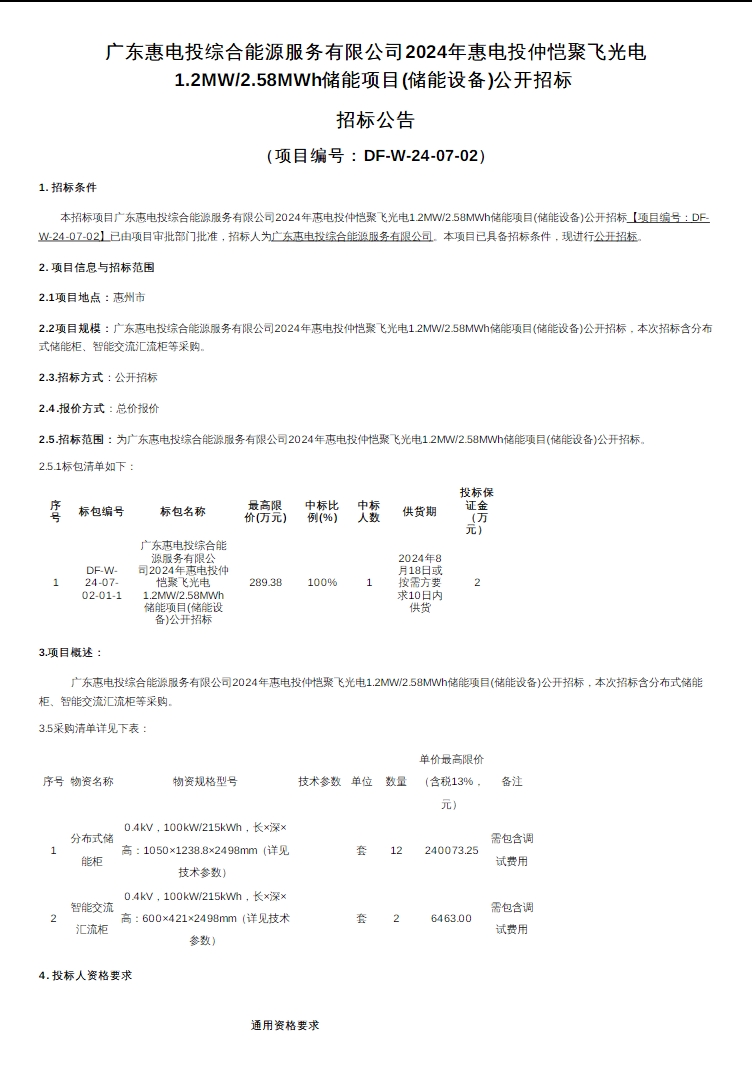 7月16日,南方电网发布了广东惠电投综合能源服务有限公司2024年惠电投仲恺聚飞光电1.2MW/2.58MWh储能项目(储能设备)公开招标招标公告,项目招标人为南方电网旗下广东惠电投综合能源服务有限公司。