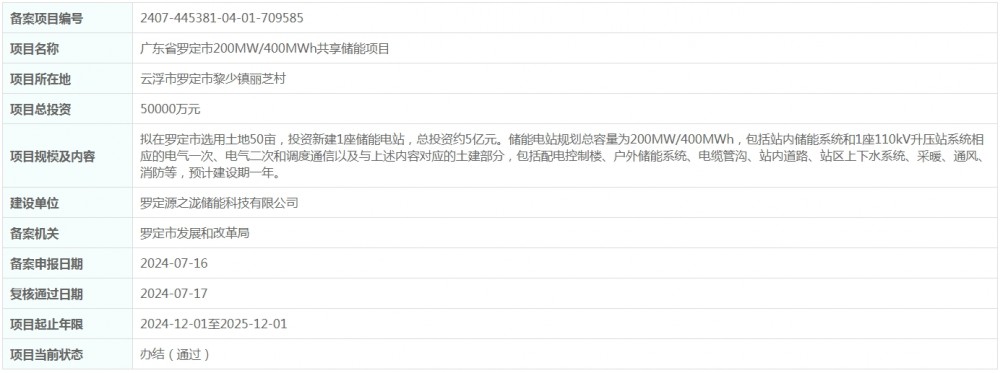 近日,广东省罗定市200MW/400MWh共享储能项目获得备案。项目位于云浮市罗定市黎少镇丽芝村,总投资50000万元。