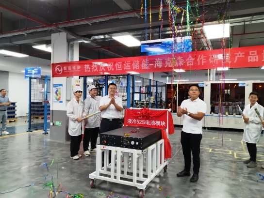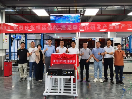 2024年7月8日,恒运储能公司在产品智造中心三楼举行了由恒运储能-海克森合作研发的液冷52S电池模块产品量产下线剪彩活动。恒运储能公司丁翀总经理、海克森能源公司孙伟凯董事长及双方各部门负责人出席了此次剪彩活动,共同见证这一历史时刻。