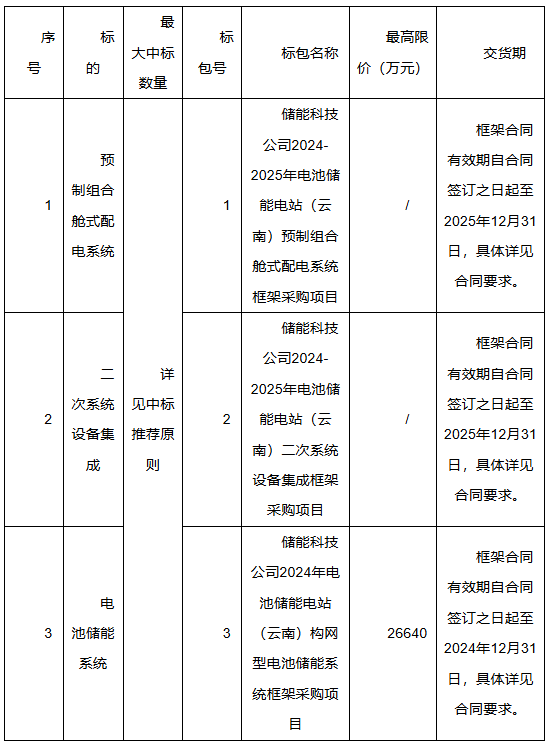 标包3.储能科技公司2024年电池储能电站(云南)构网型电池储能系统框架采购项目。框架合同有效期自合同签订之日起至2024年12月31日。