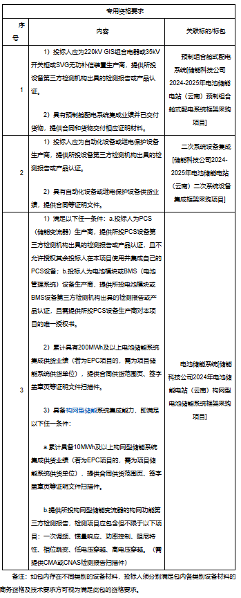 2.2招标范围:标包1.储能科技公司2024-2025年电池储能电站(云南)预制组合舱式配电系统框架采购项目。主要包括35kV开关柜、10kV进线柜、站用变压器、接地变压器、SVG无功补偿装置、预制舱式组合电器及配套设备、避雷器、电容式电压互感器、局放在线监测系统、微水在线监测系统、SF6 气体密度监测装置等设备和其他相关辅助配套材料及技术服务。