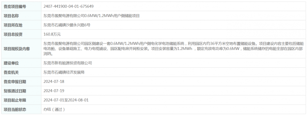 近日,东莞市盈聚电源有限公司0.6MW/1.2MWh用户侧储能项目获得备案。项目位于东莞市石碣镇沙腰永兴路6号,总投资160.8万元。