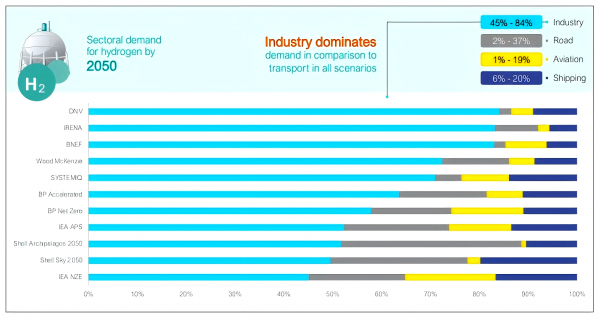 这份报告的主要内容之一是潜在需求的高度可变性。工业将主导氢的需求。然而,航运可以作为氢经济的推动者发挥关键作用。