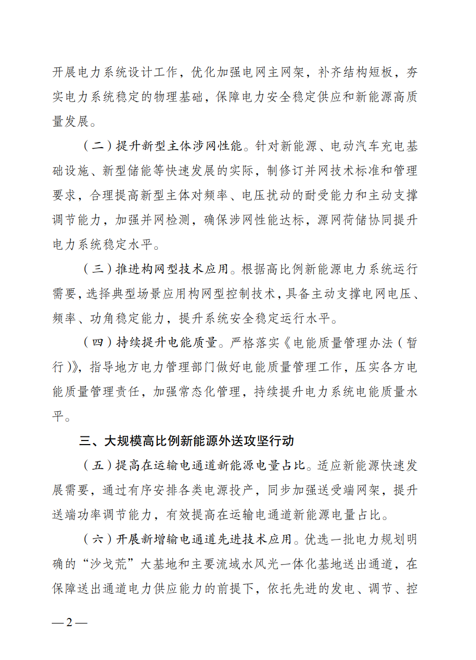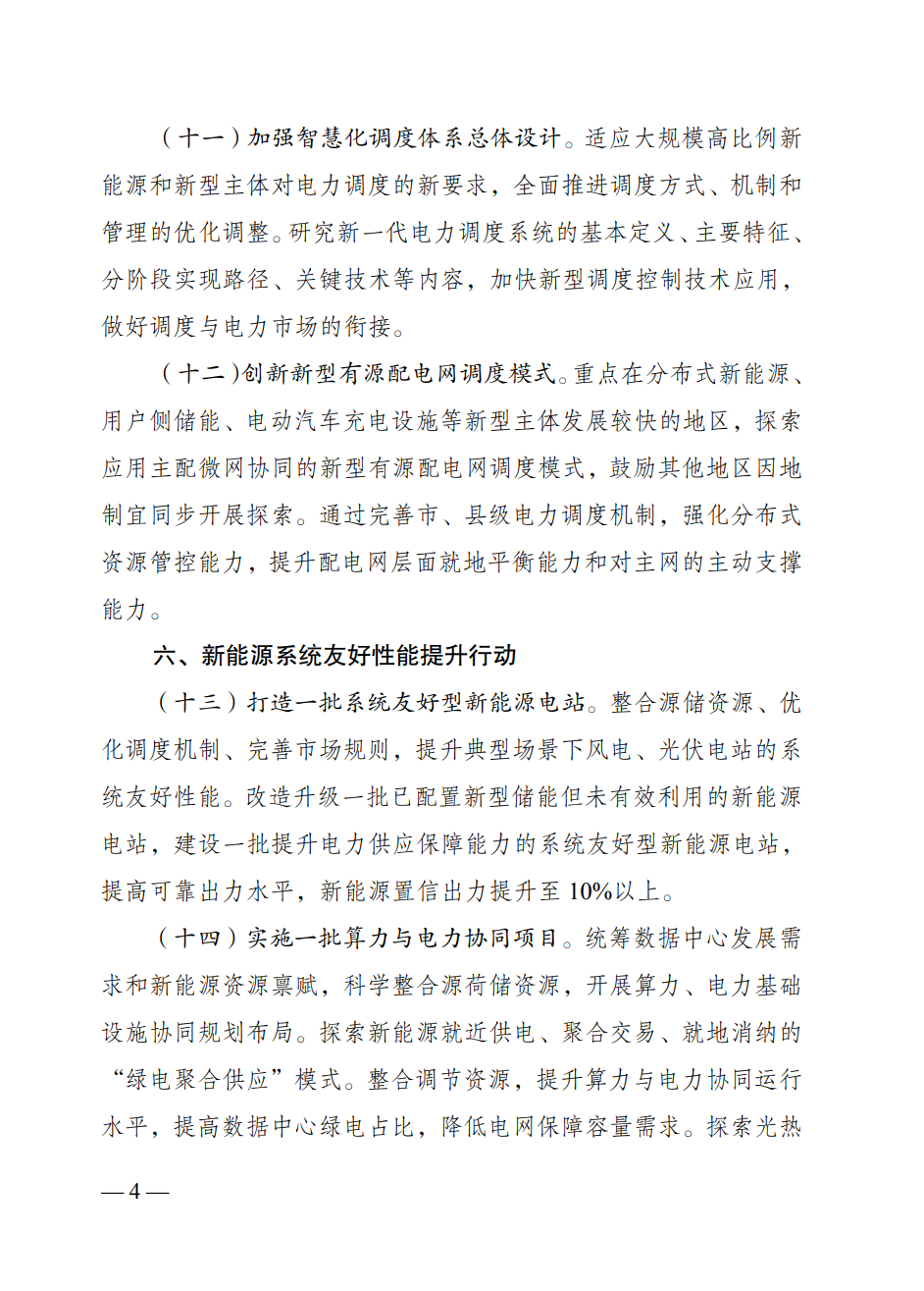 打造一批系统友好型新能源电站。整合源储资源、优化调度机制、完善市场规则,提升典型场景下风电、光伏电站的系统友好性能。改造升级一批已配置新型储能但未有效利用的新能源电站,建设一批提升电力供应保障能力的系统友好型新能源电站, 提高可靠出力水平,新能源置信出力提升至 10%以上。