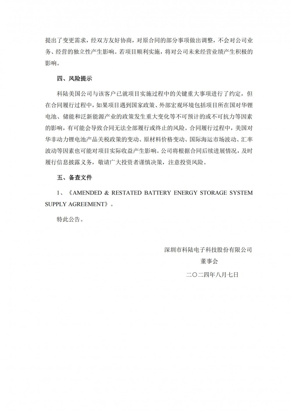 8月7日,科陆电子发布公告称,近日,科陆美国公司与该客户协商一致,就原合同签订了《AMENDED RESTATED BATTERY ENERGY STORAGE SYSTEM SUPPLY AGREEMENT(电池储能系统供应合同变更重述)》,对原合同的部分内容进行了重新约定。本次合同变更后,科陆美国公司向该客户销售集装箱式电池储能系统的容量由600MWh变更为800MWh,合同金额、交期、技术协议等内容随容量变化进行相应调整。