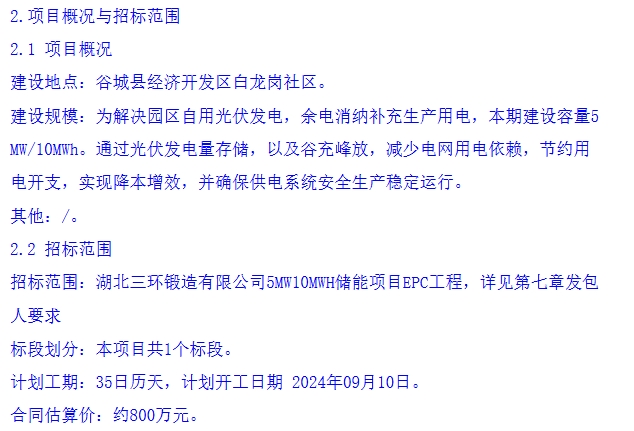 招标范围:湖北三环锻造有限公司5MW10MWH储能项目EPC工程