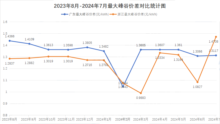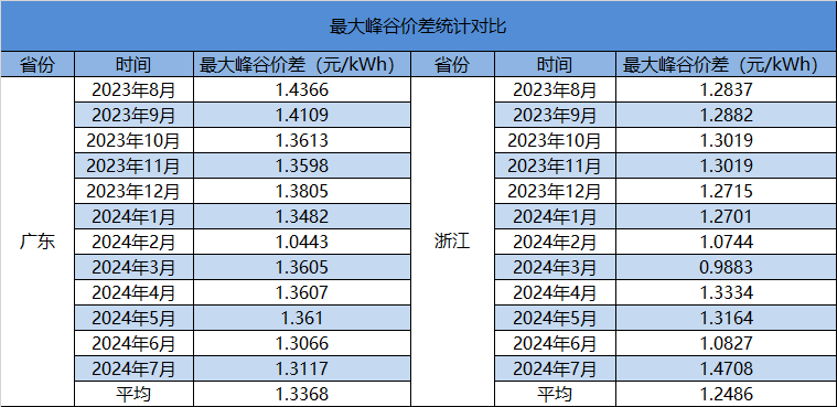 而同一时间范围内,广东曾出现的最大峰谷电价差最高为1.4366元/kWh,最低为1.0443元/kWh,其平均值高达1.3368元/kWh,这一数值在全国稳居前列。