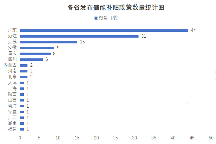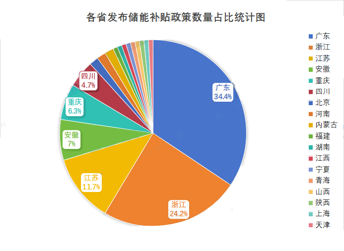其次,浙江省共发布了31项储能补贴政策;江苏省位居第三位,共发布了15项储能补贴政策。三个省发布的储能补贴政策数量约占总数的70.3%。