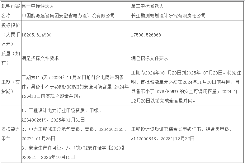 第一中标候选人为中国能源建设集团安徽省电力设计院有限公司,投标报价18205.614900万元,折合单价0.91元/Wh;