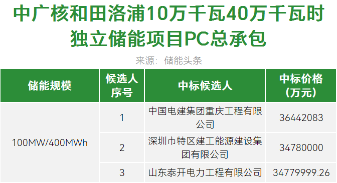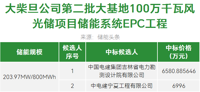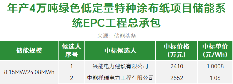 第一中标候选为兴能电力建设有限公司,投标报价2410万元,折合单价1.0008元/Wh;第二中标候选人为中能祥瑞电力工程有限公司,投标报价2552万元,折合单价1.06元/Wh。