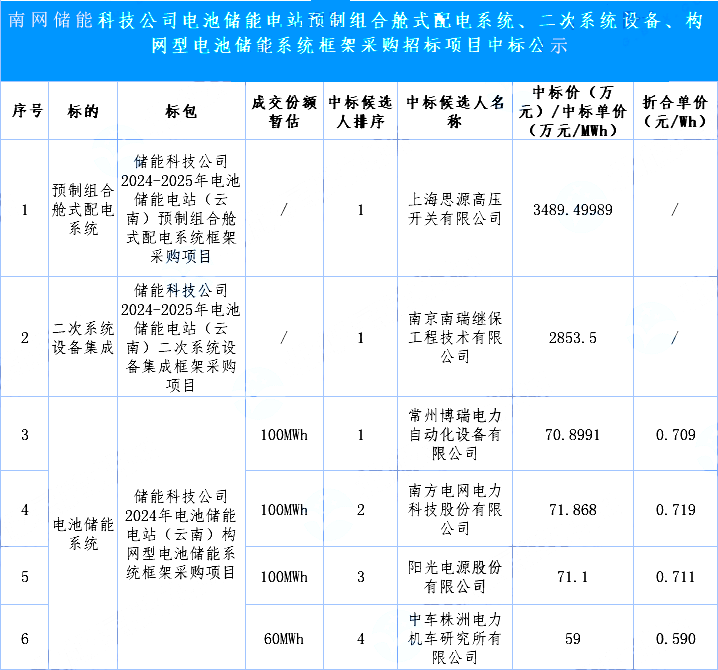最低报价0.590元/Wh!南网储能构网型储能系统框采中标公示