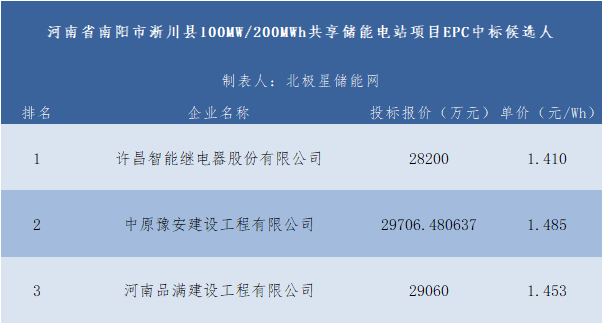 1.41元/Wh!河南南阳100MW/200MWh共享储能电站项目EPC中标候选人公示