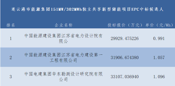 第一中标候选人:中国能源建设集团江苏省电力设计院有限公司,投标报价29929.475226万元,折合单价0.991元/Wh;