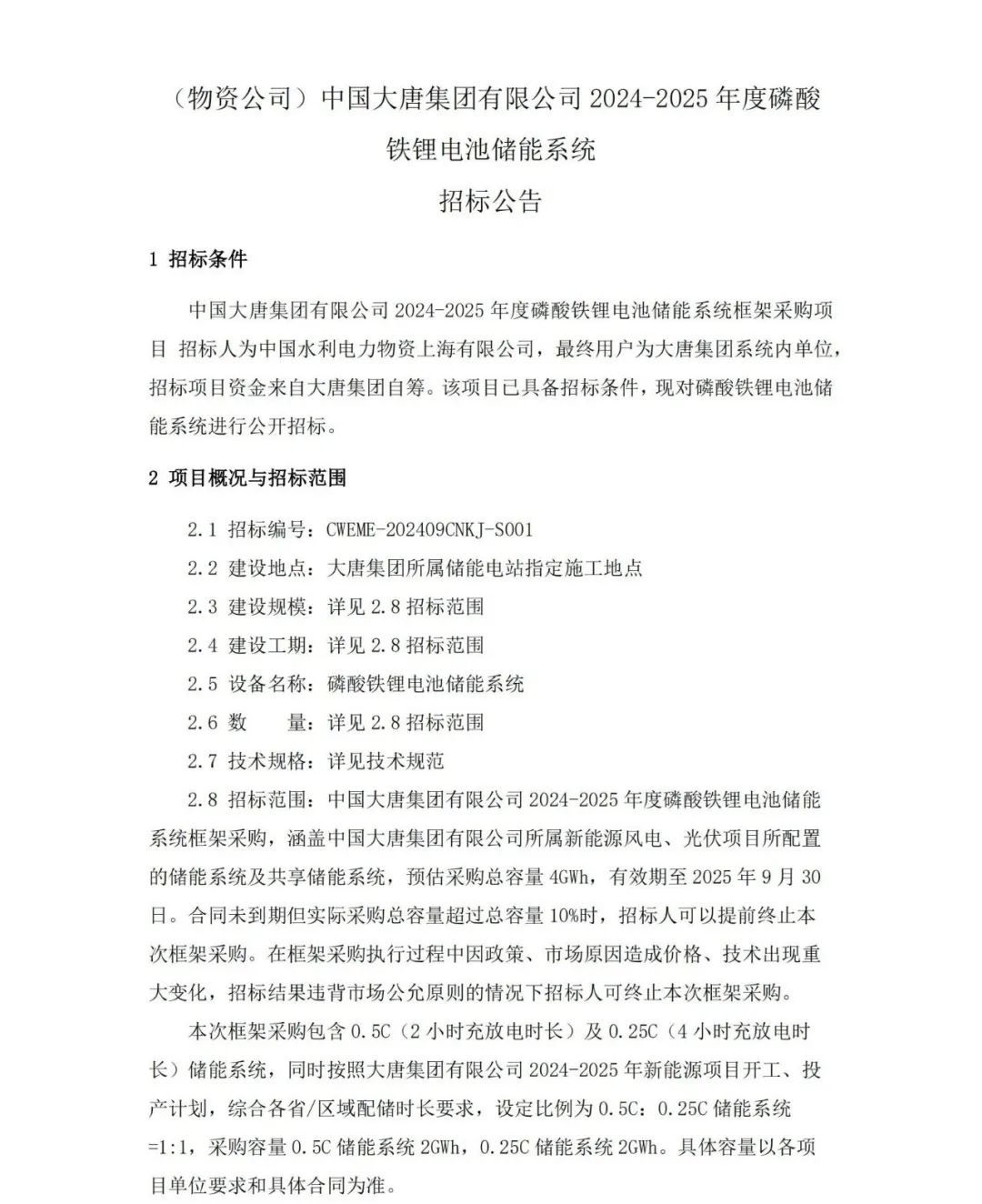 中国大唐集团有限公司 2024-2025 年度磷酸铁锂电池储能系统框架采购,涵盖中国大唐集团有限公司所属新能源风电、光伏项目所配置的储能系统及共享储能系统,预估采购总容量 4GWh,有效期至 2025 年 9 月 30日。