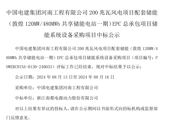 据悉,8月13日,中国电力建设200兆瓦风电项目配套储能(敦煌120MW/480MWh共享储能电站一期)EPC总承包项目储能系统设备采购项目中标公示,浙江南都电源动力股份有限公司中标该项目。