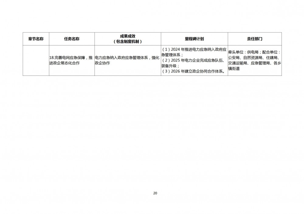 推进电力应急抢险纳入政府应急管理体系,明确电力应急管理各相关单位职责,强化应急期间信息报送机制,加快应急响应联合指挥机制建设,加强公共预警监测,强化部门协调配合,提升应对突发事件自救互救能力。加强应急队伍建设和装备提升,形成应急抢修三级梯队,增加配网融冰车、大型无人机配置,极端恶劣天气下无法及时修复电网时,利用发电车、发电机对用户进行保电。重点加强防台防汛、雨雪冰冻期间多部门协同合作,有效解决树木倒伏、路面覆冰等导致部分道路交通中断问题,同步做好村民沟通工作。实现各类开挖、吊装等施工位置信息共享,出台防外破实施方案,强化配电网外破隐患点管控,防止电力线路附近发生野蛮施工、爆破、垂钓、吊装等行为,对于外破原因造成配电网故障的,成立跟踪追责管控小组,追究相关责任单位或责任人相应责任。(牵头单位:供电局;配合单位:公安局、自然资源局、住建局、交通运输局、应急管理局、各乡镇街道)